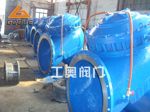下圖是工奧公司為四川成都一個(gè)客戶(hù)生產(chǎn)制造的12臺(tái),DN1000 鑄鋼材質(zhì) 的 16壓力 JD745X多功能水泵控制閥,此批閥門(mén)主要應(yīng)用在自來(lái)市政工程管道當(dāng)中,用于水泵的控制、保護(hù)水泵停機(jī)后水倒流,而引起水泵倒轉(zhuǎn)從而損壞閥門(mén),本公司對(duì)于生產(chǎn)的這批產(chǎn)品嚴(yán)格打擊,按照1.5倍試驗(yàn)、確保閥門(mén)質(zhì)量達(dá)到項(xiàng)目要求。