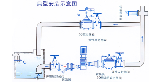 其在項目當(dāng)中具體的作用是:彈性座封閘閥:由于采用特殊結(jié)構(gòu)設(shè)計能夠有效的控制水力控制管道的整個水向的流動、Y型過濾器:用于過濾水中的污物或者雜質(zhì)、水泵:用于抽出管道中的水從而使其流動、而300X型緩閉止回閥:產(chǎn)品在設(shè)計時可以緩閉,使從閥能夠以最佳的狀態(tài)開啟和關(guān)閉,并且能夠有效的防止水錘產(chǎn)生、而500X泄壓閥:此種產(chǎn)品做為泄壓閥時可以維持供水路壓力在設(shè)定的安全值之下,并且能夠自動控制、YQ9000活塞式水錘吸納器:則能夠通過橡膠有效的消除各類水錘;