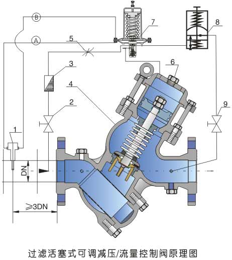 1.畢托管 2.球閥 3.過濾器 4.主閥 5.針閥 6.開度指示器 7.限流導(dǎo)閥 8.減壓導(dǎo)閥 9.球閥