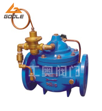 1、限流功能該閥安裝于水泵出口,在單泵啟動(dòng)和非全數(shù)設(shè)計(jì)工作泵工作時(shí),多工作泵起限制 流量作用,使泵在較高效率狀態(tài)下工作;防止電動(dòng)機(jī)愛水泵低揚(yáng)程、大流量、低效率時(shí),發(fā)生過載現(xiàn)象;防止超額定電流燒電機(jī)現(xiàn)象的發(fā)生,同時(shí)起到一定的節(jié)能效 果。其限流原理為:依據(jù)水泵的設(shè)計(jì)工況揚(yáng)程,導(dǎo)閥自動(dòng)檢測(cè)并控制水泵的實(shí)際工作揚(yáng)程,以限制水泵的工作流量,限制電機(jī)的負(fù)載。該閥設(shè)定一個(gè)控制工作氣揚(yáng) 程,當(dāng)水泵工作揚(yáng)程低于控制揚(yáng)程時(shí)閥門做關(guān)閥動(dòng)作,使實(shí)際工作揚(yáng)程加大;當(dāng)水泵工作揚(yáng)程大于設(shè)定揚(yáng)程時(shí)閥門全開,閥門阻力極小??刂茪鈸P(yáng)程的設(shè)定可以按電 機(jī)額定電流設(shè)定,也可以按高效率工況設(shè)定,該閥門工作揚(yáng)程設(shè)定值可調(diào),一般出廠設(shè)定值為設(shè)計(jì)工況揚(yáng)程。